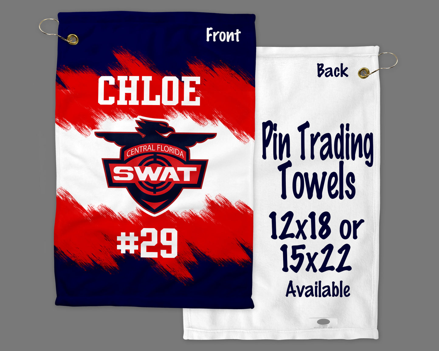 These pin trading towels are perfect for keeping your pins at tournaments! The towels can be customized to match your team colors and can also be personalized with their names and numbers. The towel measures 12" x 18" (we have another listing for the larger 15"x22" towel). It can be made either tall as shown in the main image or wide as shown in the actual image of the towel. The towel is sublimated so the printing is permanent, which means it won't rub off or peel! The back side of the towel is white, but can be printed on for an additional cost. The material is made of a soft microfiber.