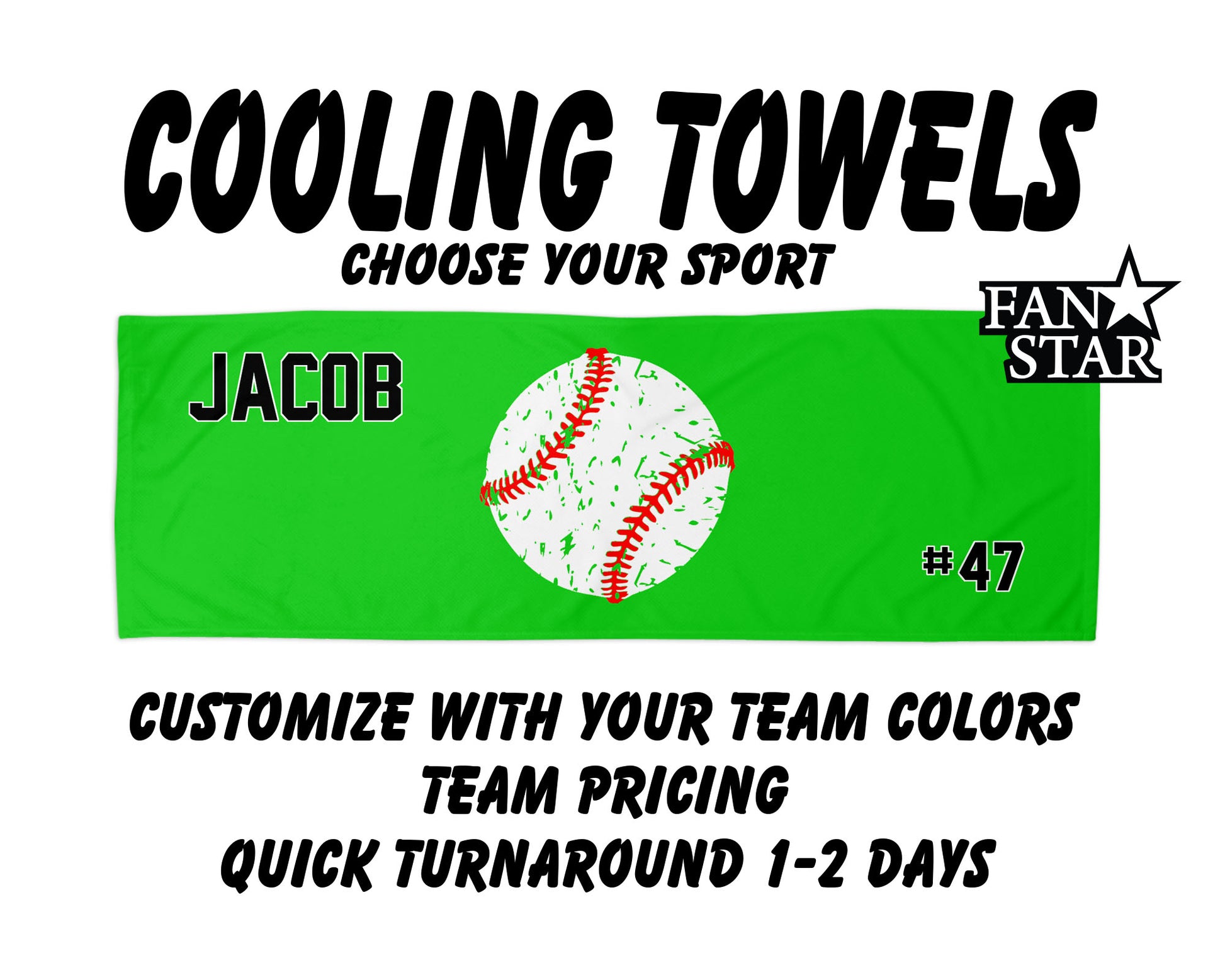 These cooling towels are perfect for keeping your athletes cool! The towels can be customized to match your team colors and can also be personalized with their names and numbers. The towel measures 12" tall by 31-1/2" wide. The towel is sublimated so the printing is permanent, which means it won't rub off or peel! The back side of the towel is white. The towel can be machine washed and dried; however, it is recommended to not dry with fabric softener.