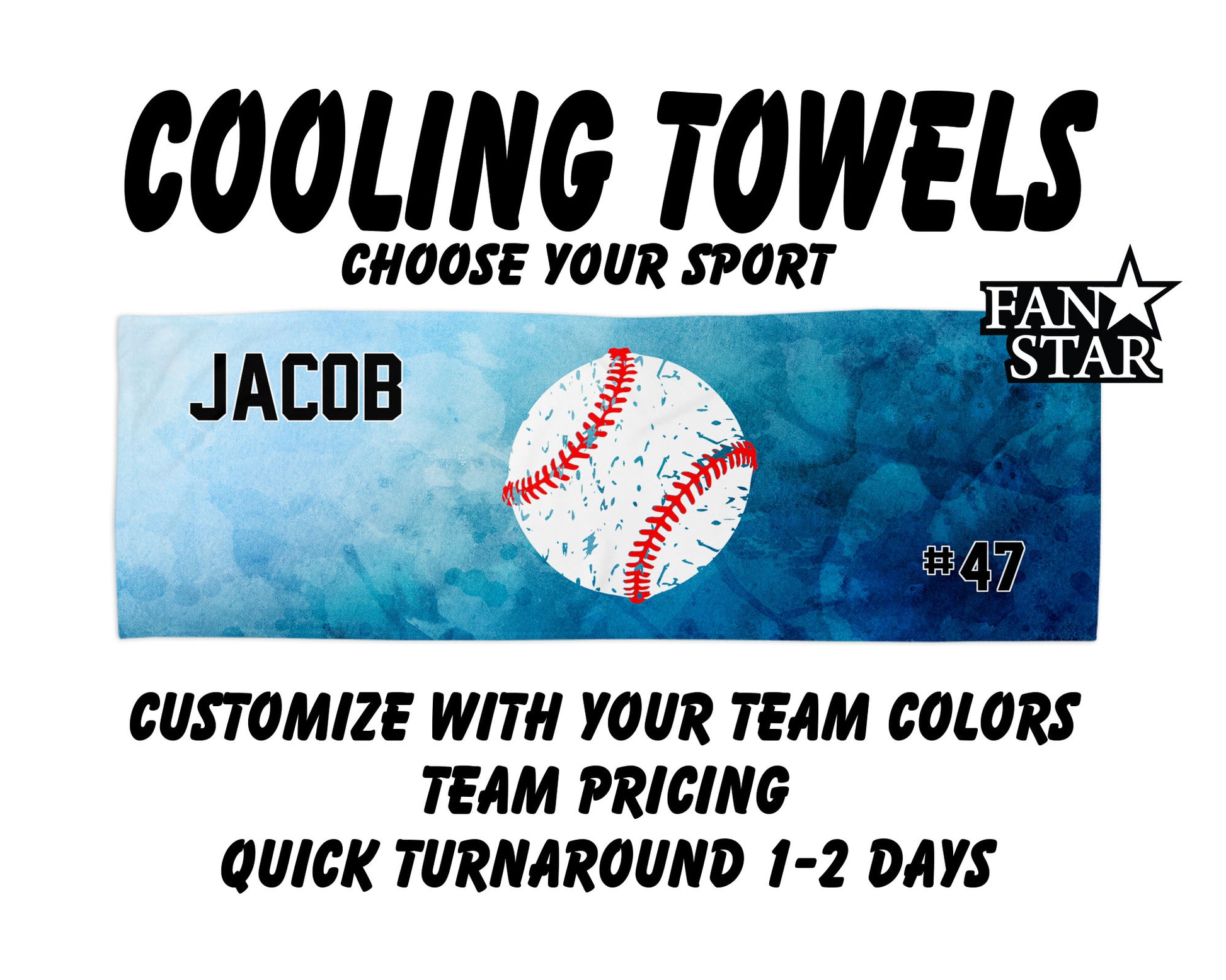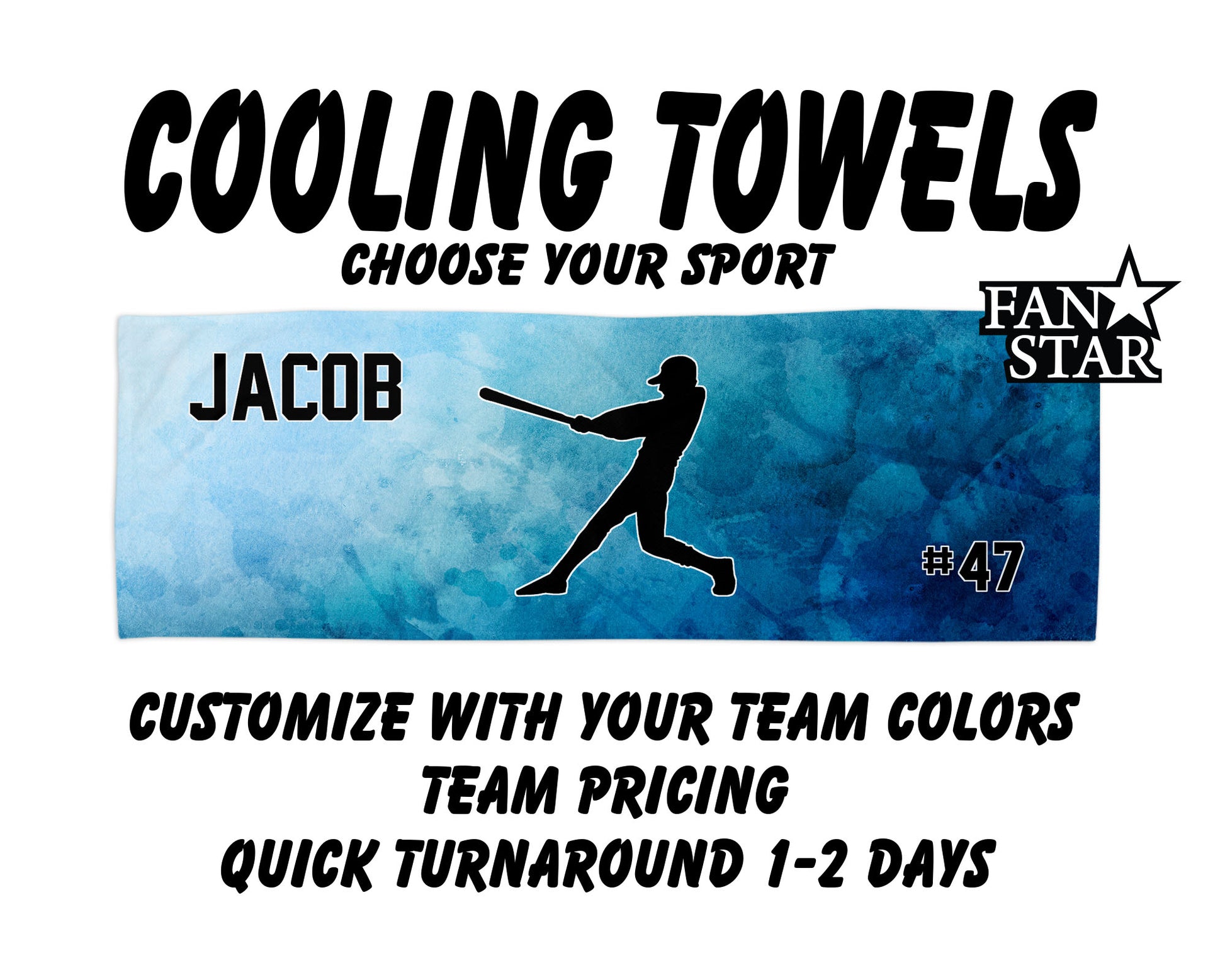 These cooling towels are perfect for keeping your athletes cool! The towels can be customized to match your team colors and can also be personalized with their names and numbers. The towel measures 12" tall by 31-1/2" wide. The towel is sublimated so the printing is permanent, which means it won't rub off or peel! The back side of the towel is white. The towel can be machine washed and dried; however, it is recommended to not dry with fabric softener.