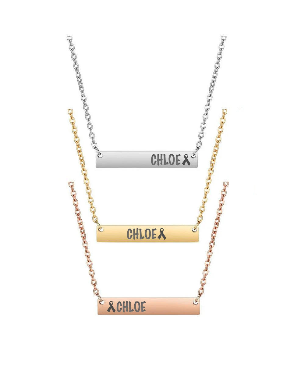 This stunning necklace makes a great keepsake. The name and logo are engraved onto the pendant. The bar measures 1-1/2" long and 1/4" tall. It is available in 3 finishes: Stainless Steel, Rose Gold Plated, and Gold Plated. It also comes with the chain length of your choice.