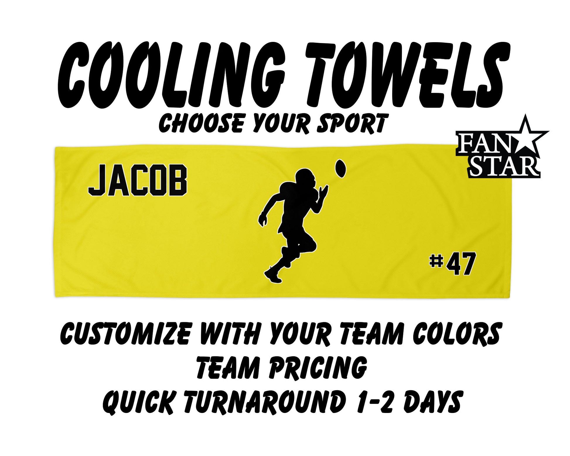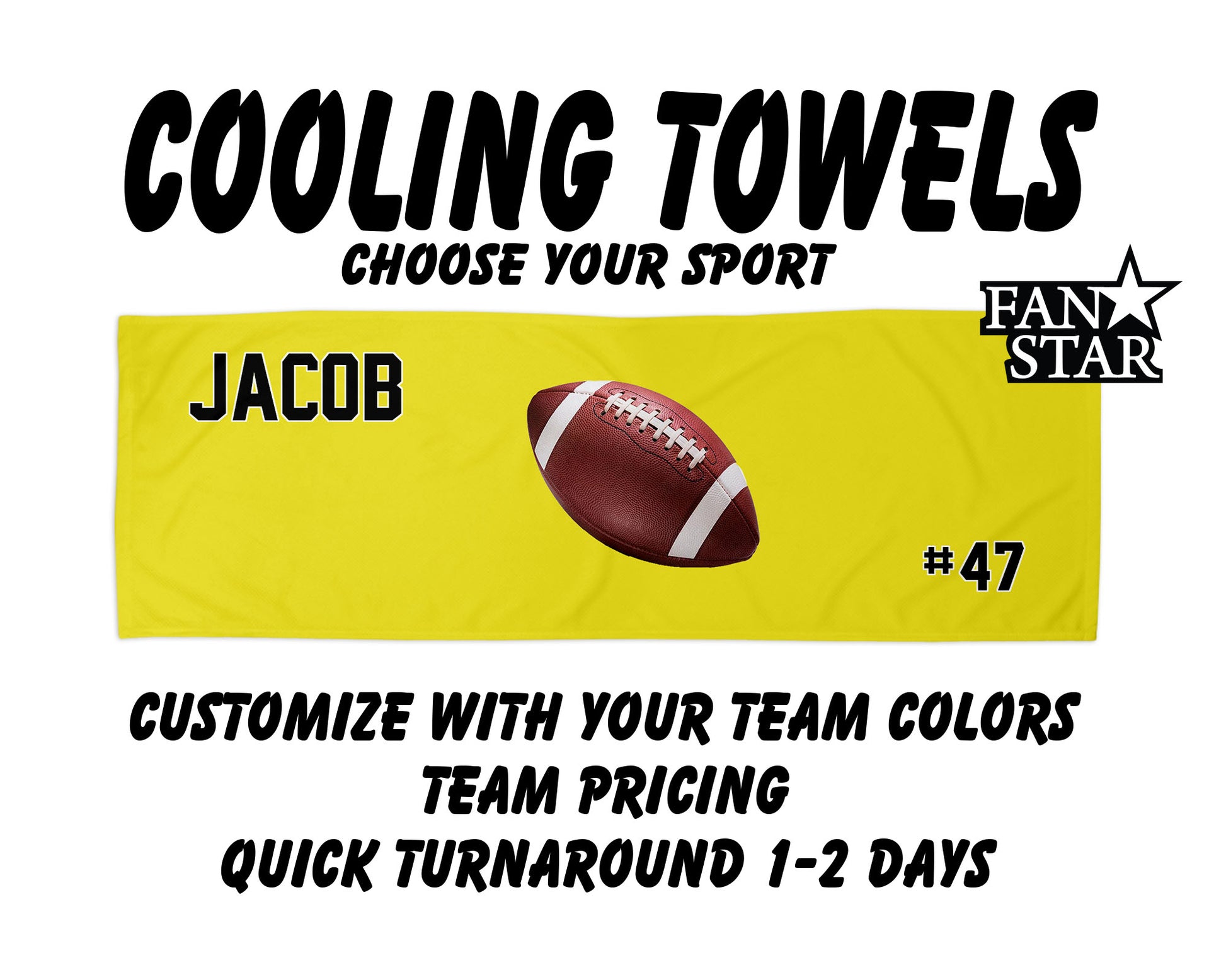 These cooling towels are perfect for keeping your athletes cool! The towels can be customized to match your team colors and can also be personalized with their names and numbers. The towel measures 12" tall by 31-1/2" wide. The towel is sublimated so the printing is permanent, which means it won't rub off or peel! The back side of the towel is white. The towel can be machine washed and dried; however, it is recommended to not dry with fabric softener.