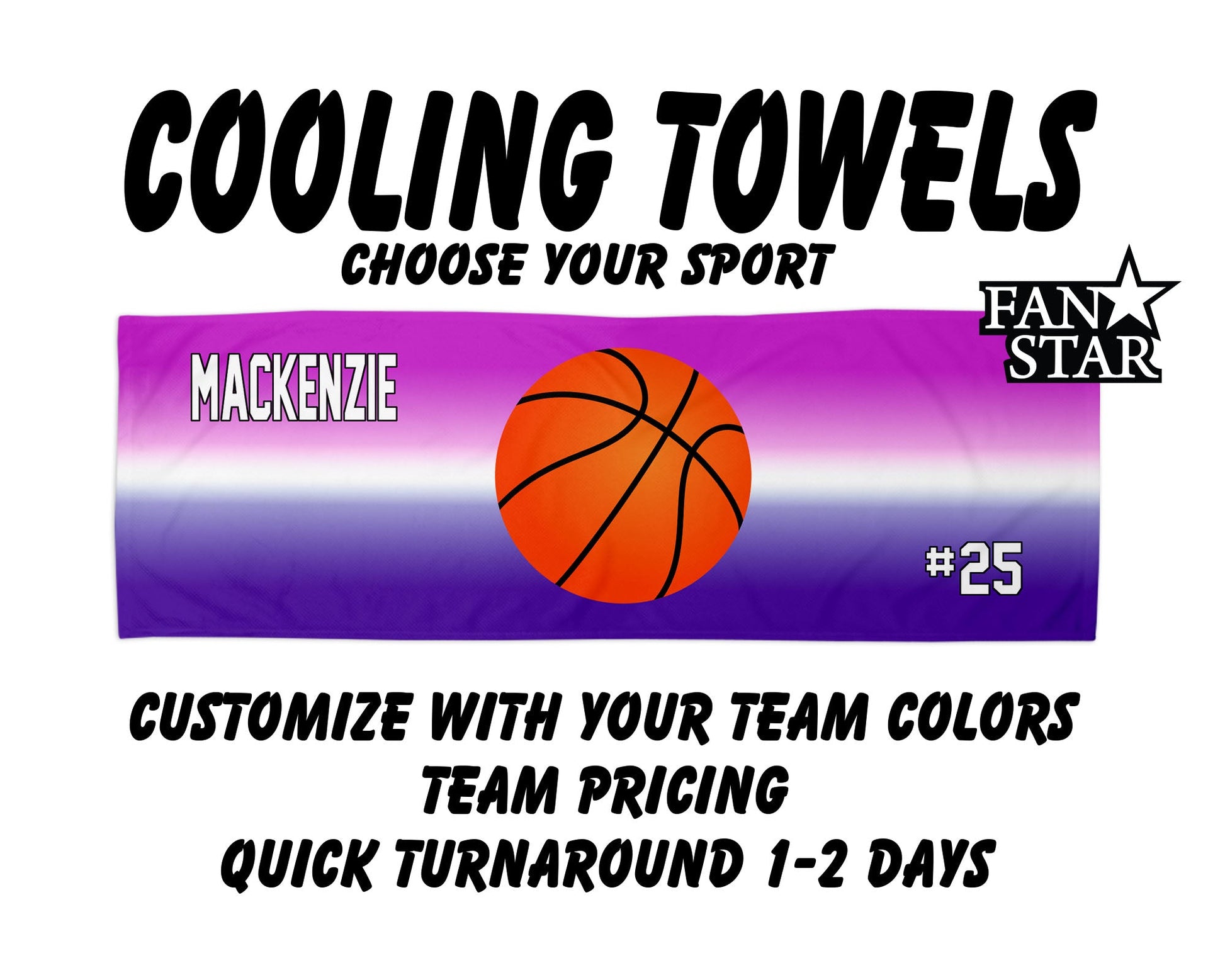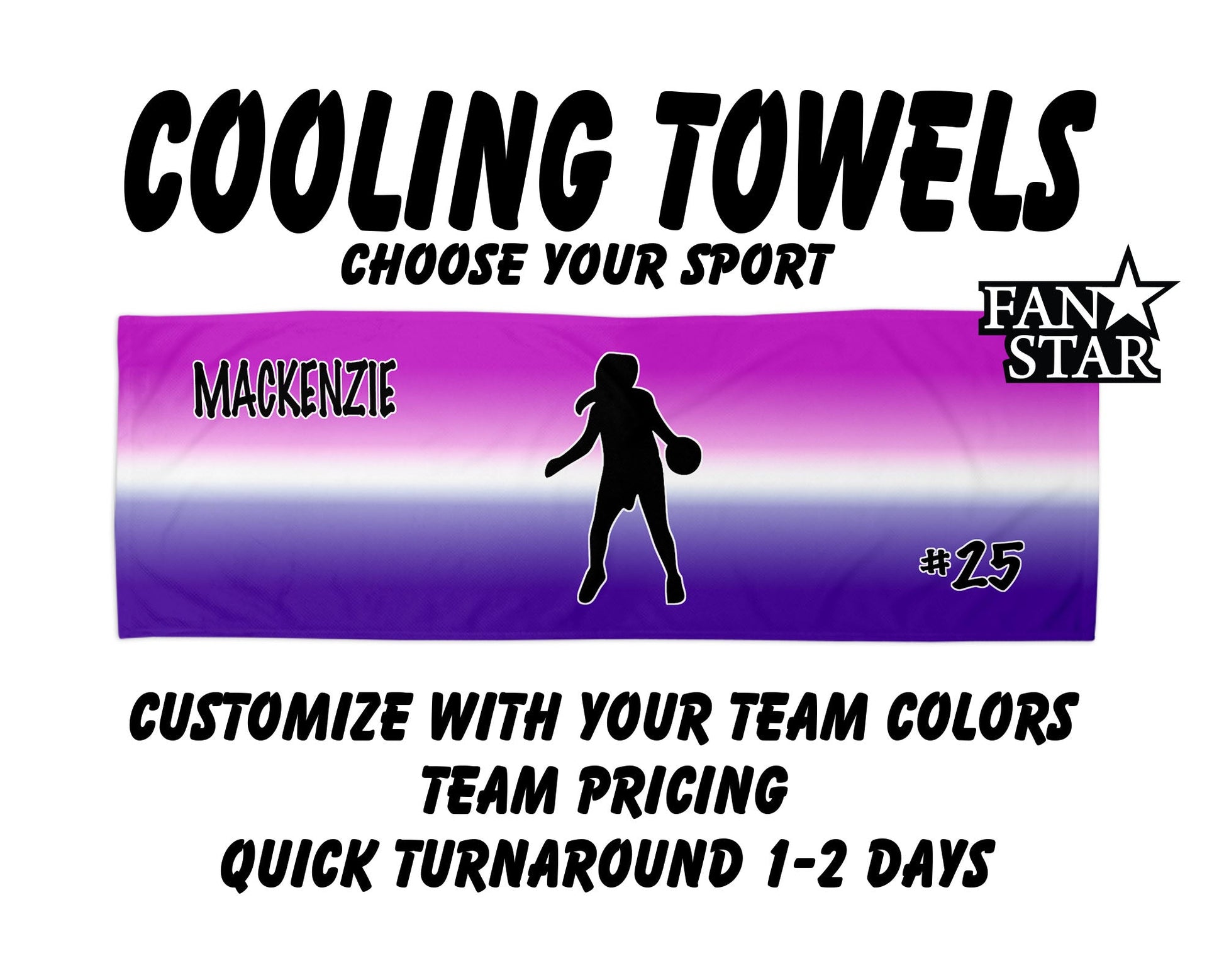These cooling towels are perfect for keeping your athletes cool! The towels can be customized to match your team colors and can also be personalized with their names and numbers. The towel measures 12" tall by 31-1/2" wide. The towel is sublimated so the printing is permanent, which means it won't rub off or peel! The back side of the towel is white. The towel can be machine washed and dried; however, it is recommended to not dry with fabric softener.