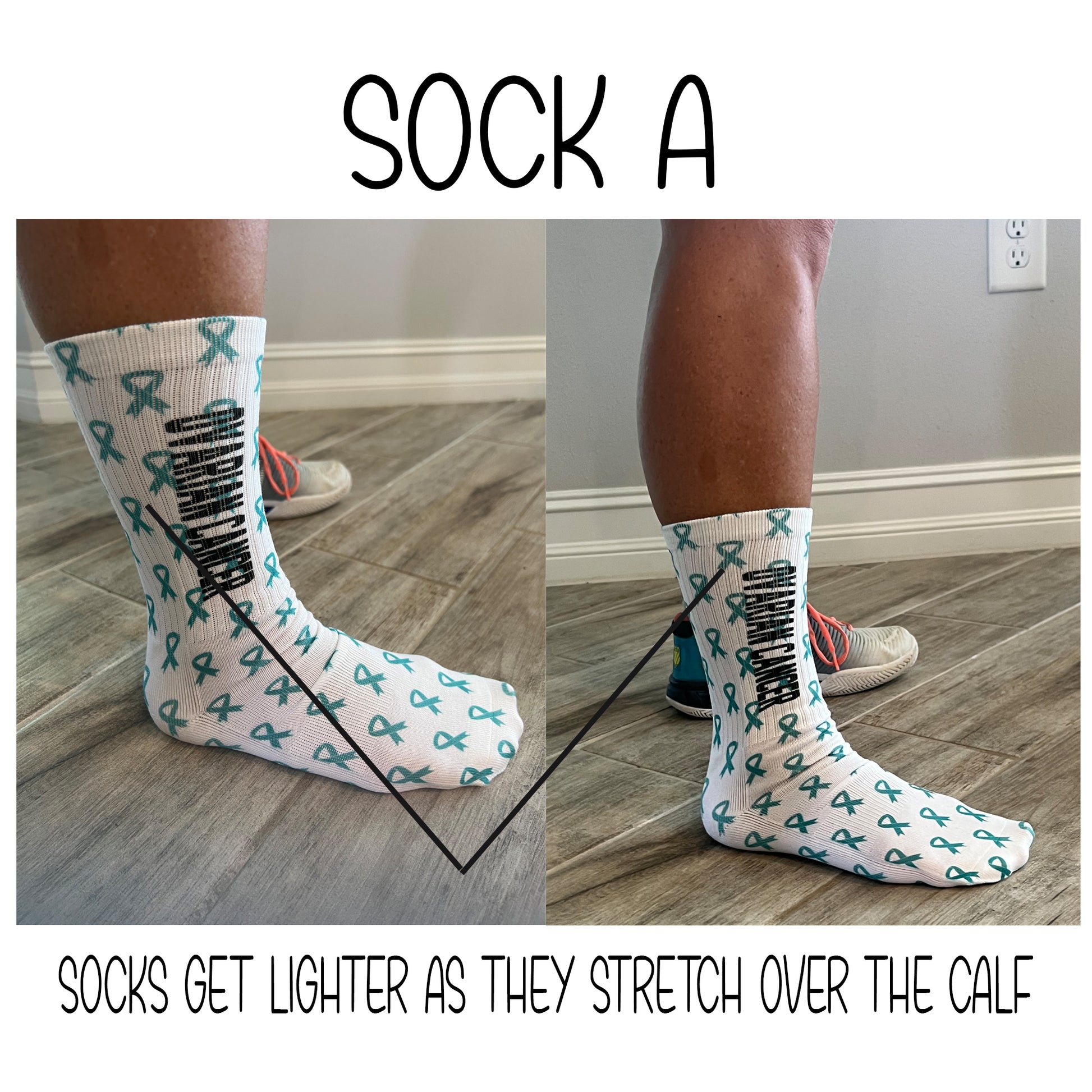 These amazing socks make the perfect gift. We offer a few styles of crew socks. Style A is best for athletic socks as the top part is ribbed. They come in both youth and adult sizes. Style C also comes in a sparkle or standard sock where silver sparkles are woven in). The socks are comfortable and easy to put on. They come to the mid calf on most people. We have many designs available so if you don't see what you need, please contact us.