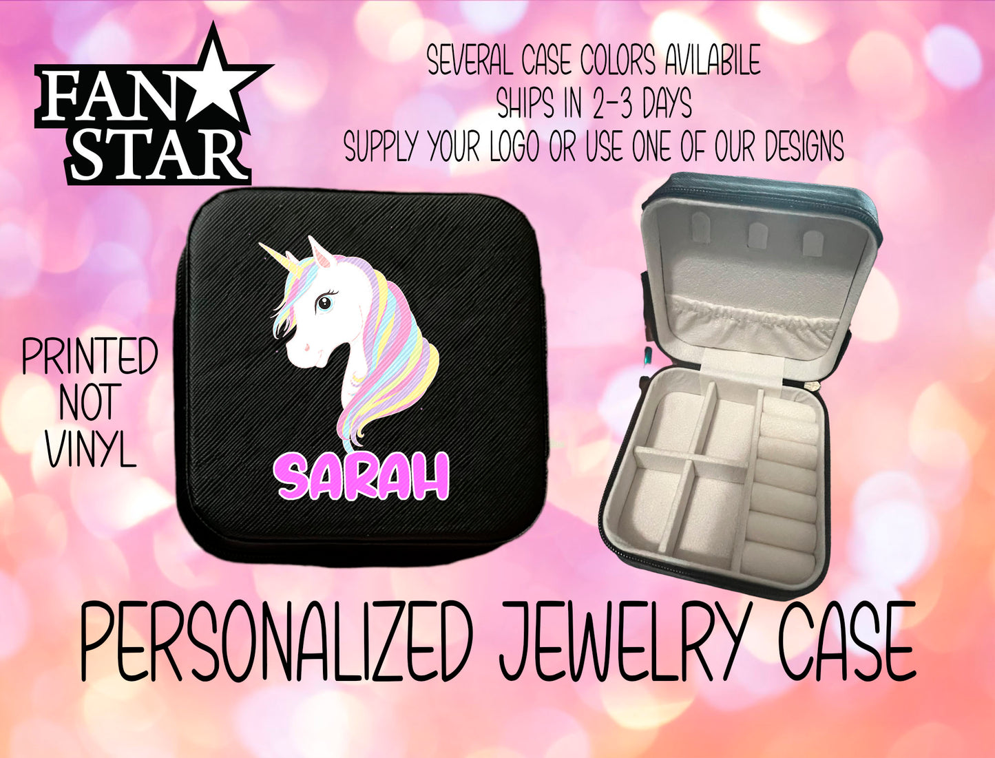 This adorable jewelry box is the perfect travel accessory. The box has a zipper that goes around the box, allowing your jewelry to be safe. There are spots for earrings, necklaces, and rings. The box measures 3.2" x 3.2". The design is printed directly onto the box.