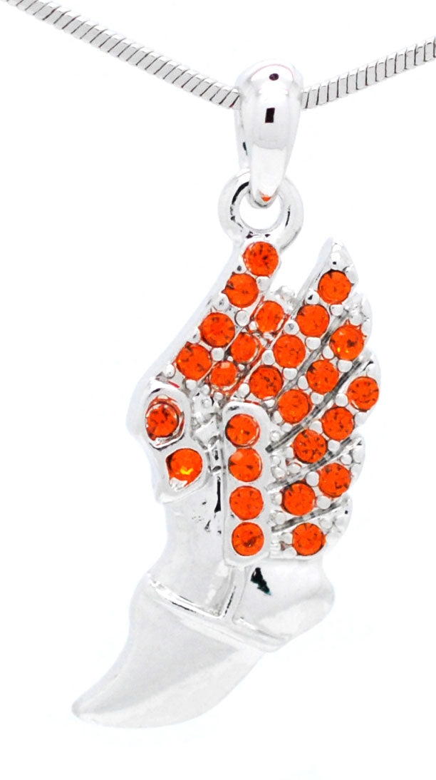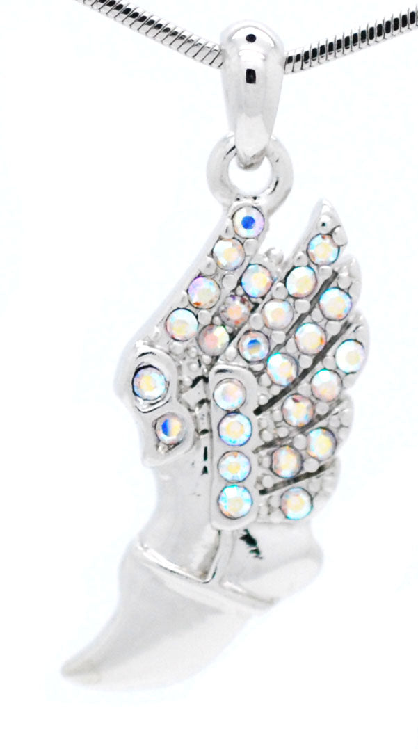 The Winged Foot Necklace is a medium size track necklace designed for athletes and sports enthusiasts who want to showcase their passion with style. This winged foot necklace features a sparkling crystal pendant that measures 1 inch tall, making it a perfect running pendant and an eye-catching piece of athlete jewelry. Crafted from rhodium plated jewelry, this tarnish resistant necklace ensures long-lasting shine and durability, ideal for everyday wear or special track meets.